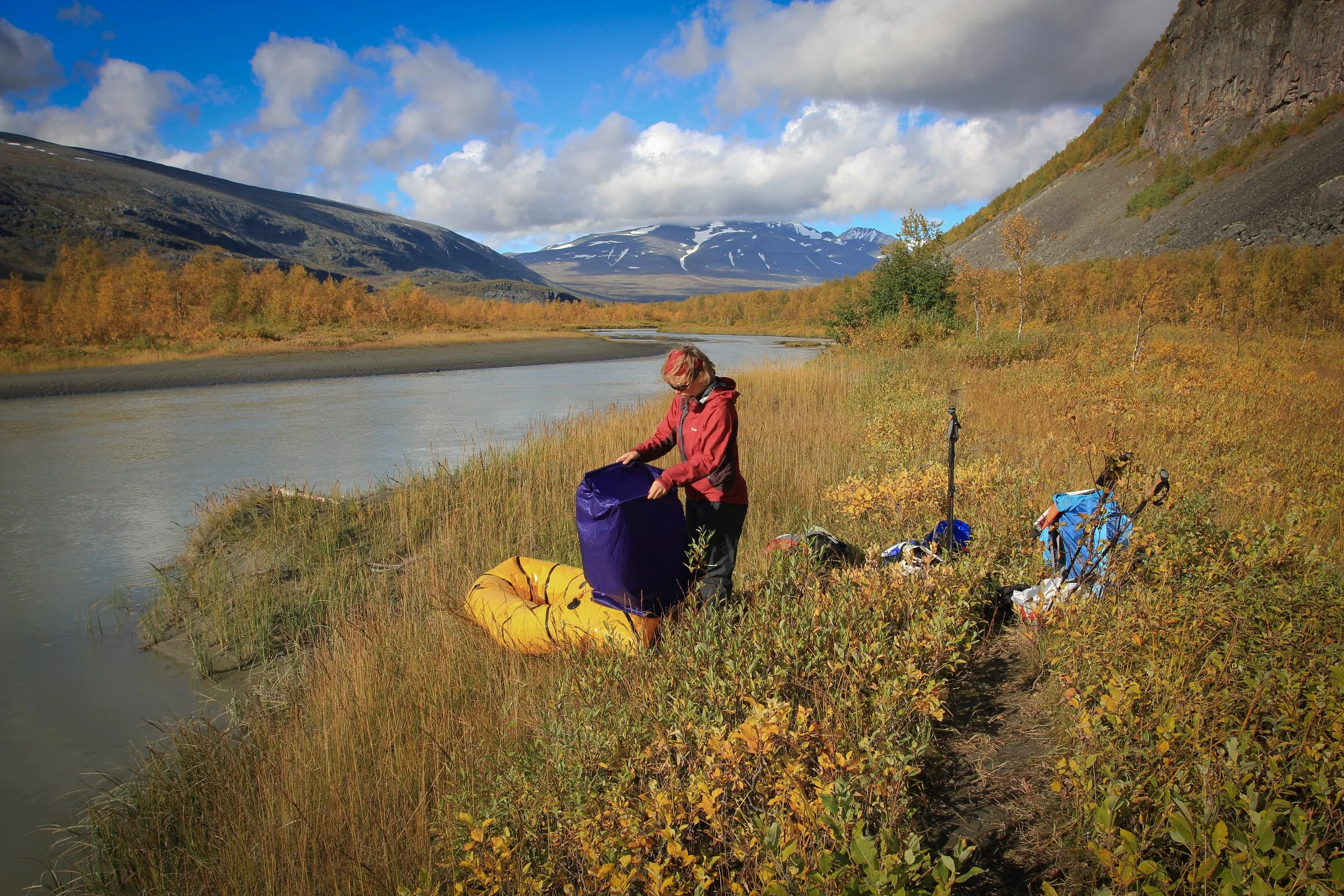 Overdag glijden we door rustige stroomversnellingen en stille bosvalleien. ’s Avonds verschijnt de eerste sterrenhemel van het najaar boven Lapland. We slaan kamp op op een zandbank of bij een houten laavu of kotta. Het vuur knettert. De lucht kleurt langzaam roze en goud. En de stilte van het Arctische landschap voelt bijna tastbaar. Gouden herfstkleuren hullen de zilverberken in een magisch deken.